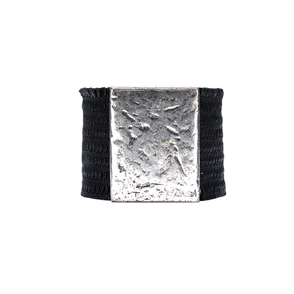 Black laser cut soft leather cuff with an antique silver embellishment and stud adjustable closure