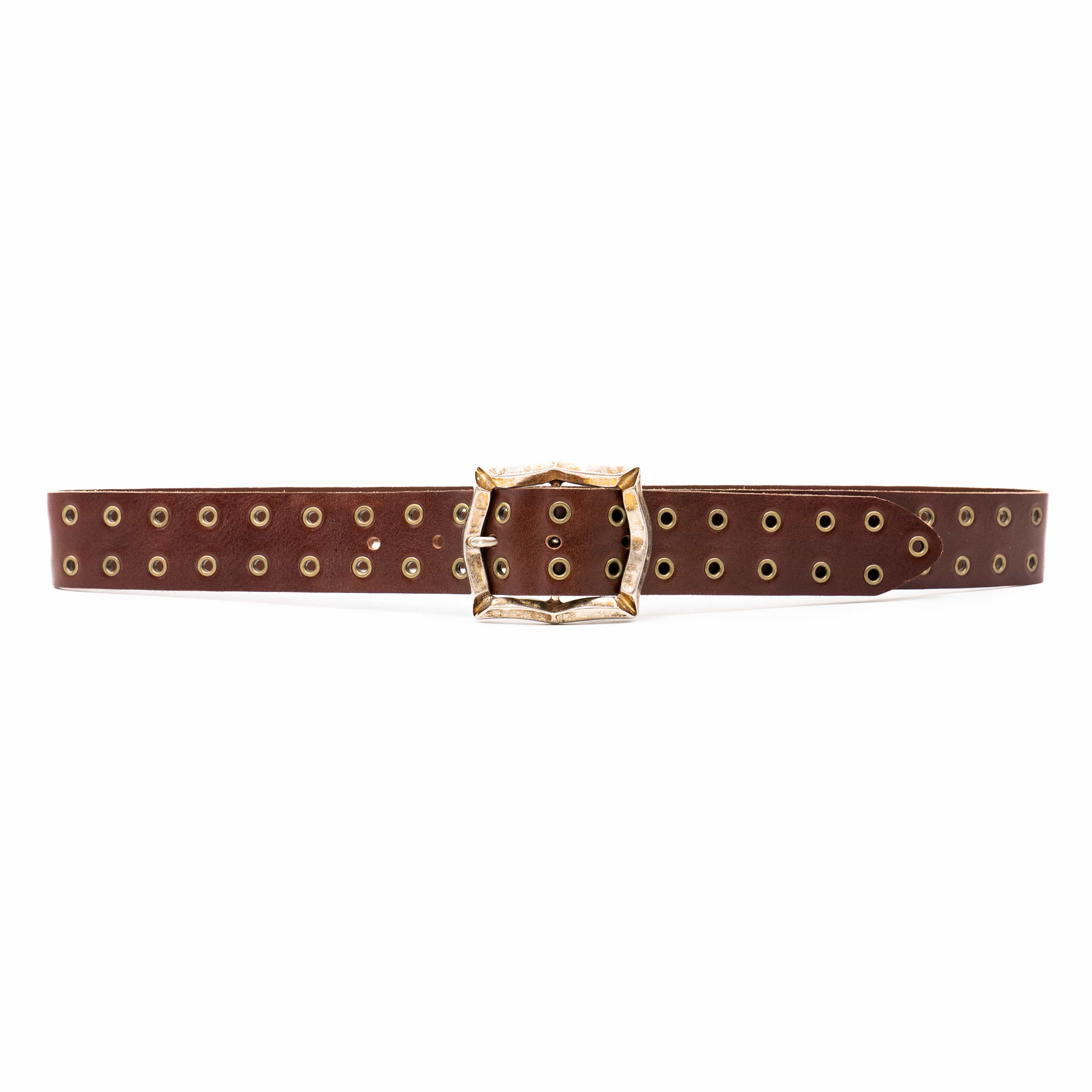 The Carter Grommet Belt is a timeless accessory that combines rustic charm with vintage elegance. Made from smooth brown Italian leather, it features brass grommet accents and a vintage-plated two-tone Italian romantic buckle. This belt is a versatile addition to your wardrobe, offering a perfect blend of classic and contemporary design.
