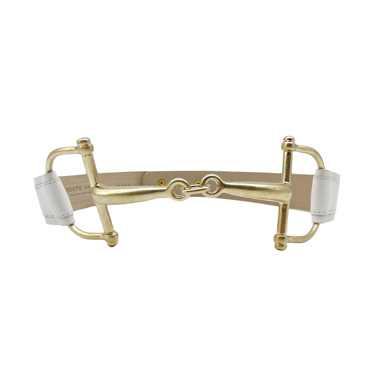 Equestrian Italian light gold plated hardware on black or off-white leather featuring a snap closure.