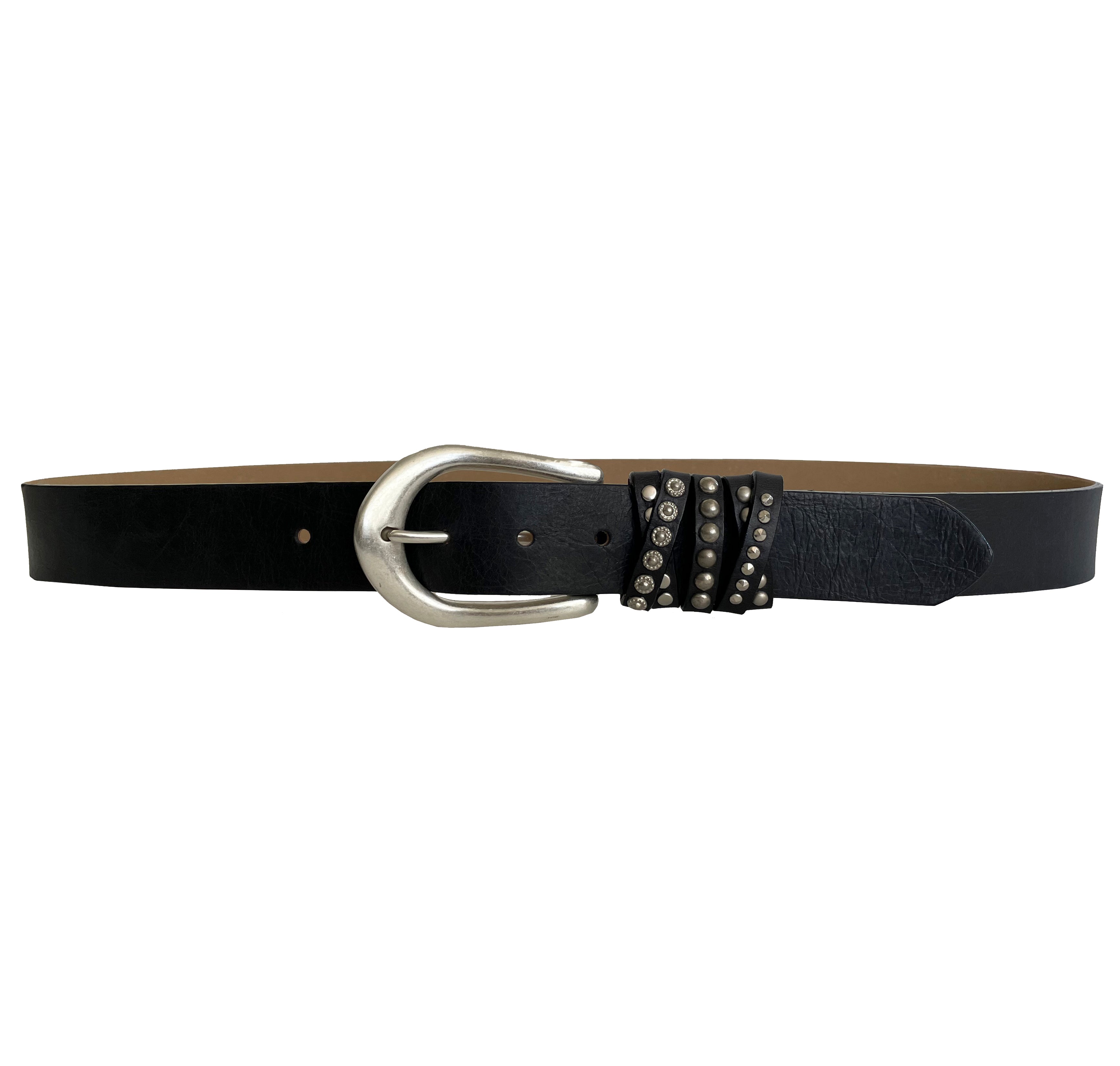 Chocolate brown, black or tan Italian leather belt with silver studded multi-loop detail and elegant silver horseshoe style buckle