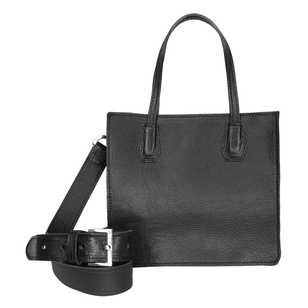 Smooth Black mini leather hand-held bag with removable adjustable strap features top zip inside pocket.