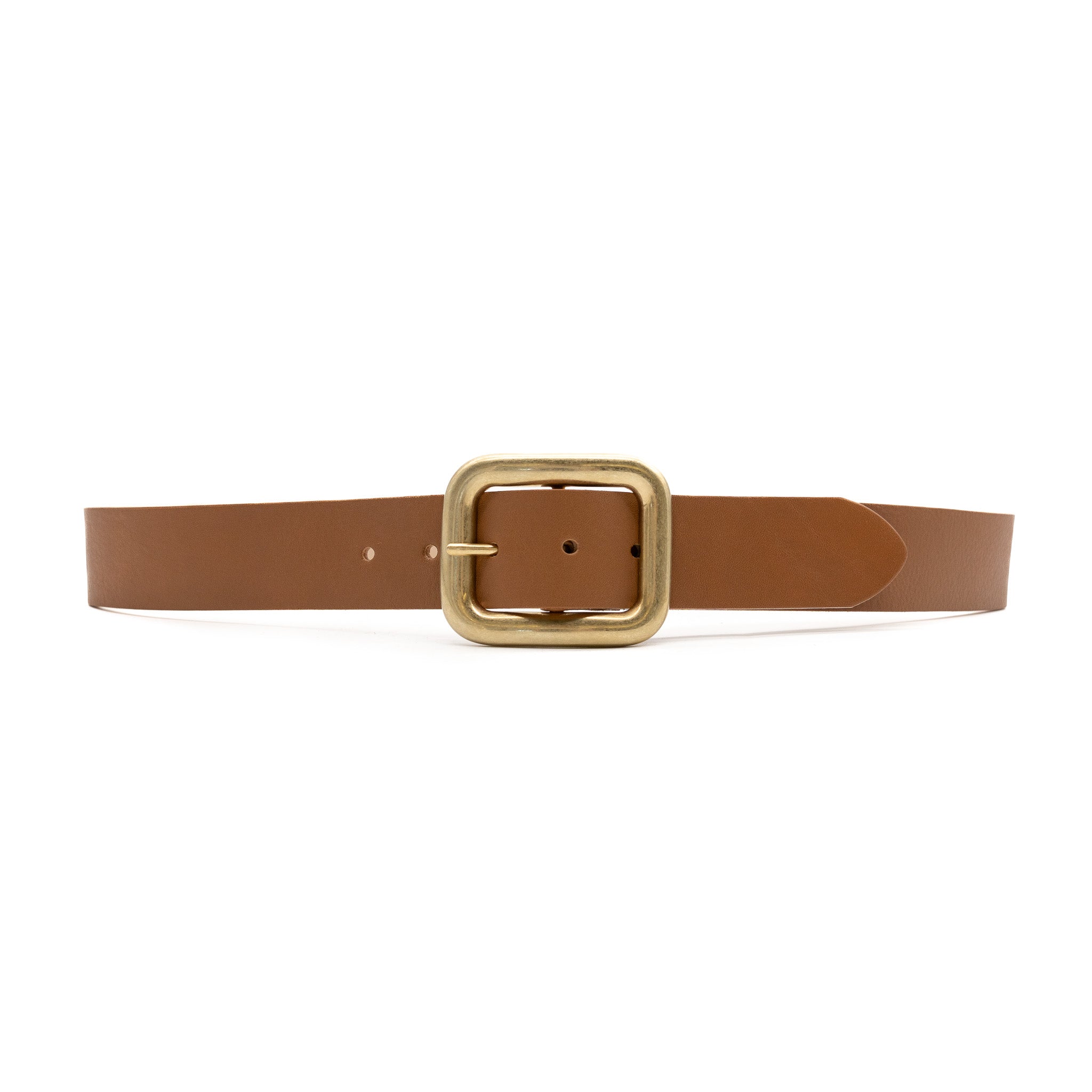 Side close-up of gold buckle detail on Natalia Belt in tan leather.