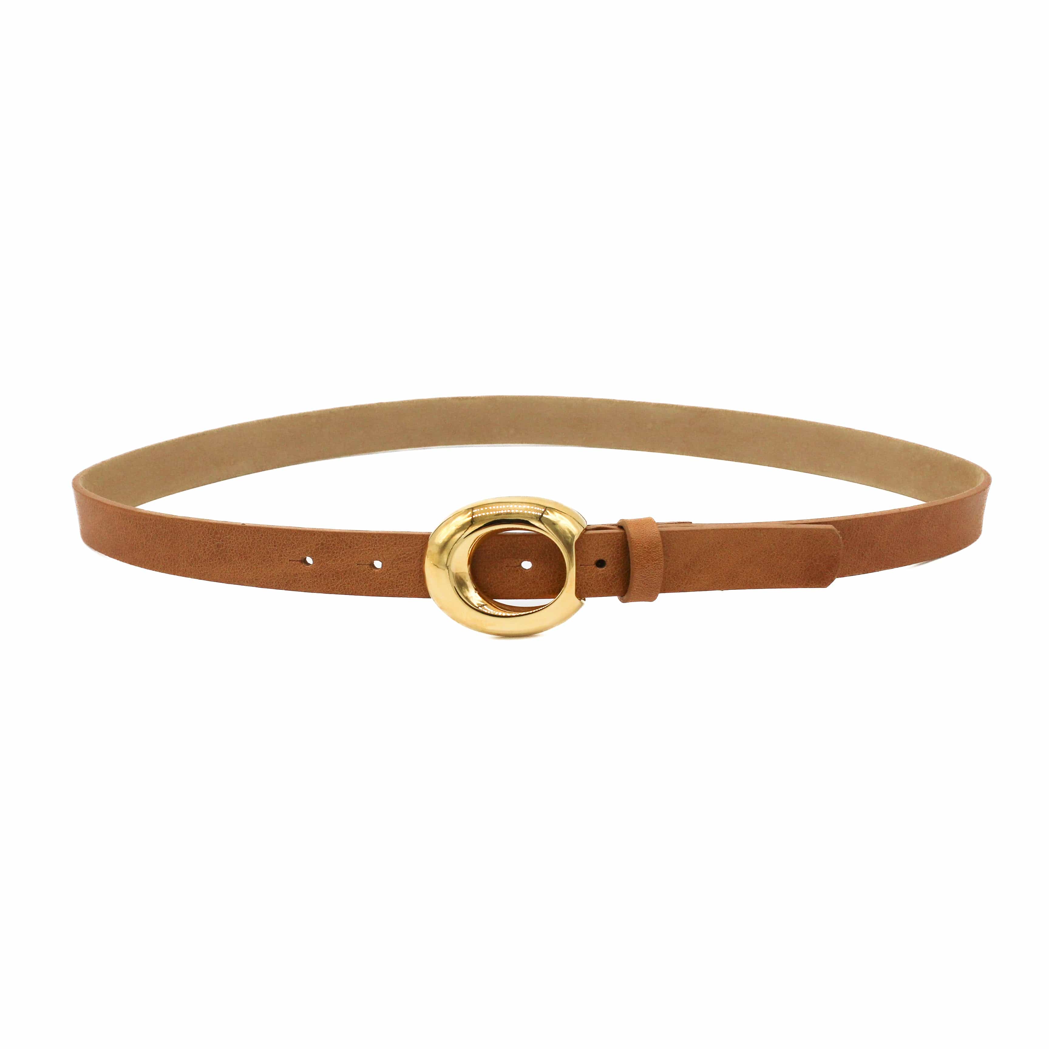 The Aamira Belt is a timeless wardrobe essential, crafted from smooth tan Italian leather and finished with a circular gold prong buckle. Its slim 1" width makes it perfect for everyday wear, whether styled through denim loops or cinched over dresses. Handcrafted in Los Angeles for enduring quality.