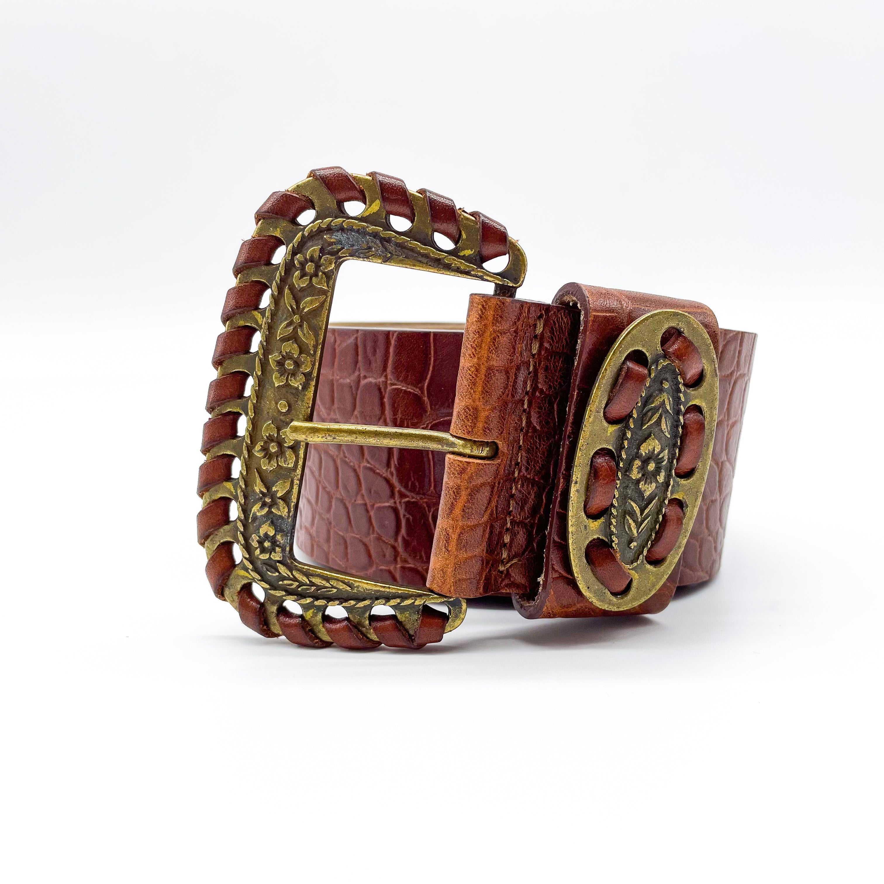 Wide waisted smooth black or cognac color croc-embossed leather belt, with vintage antique brass buckle loop and tip, laced with leather trim