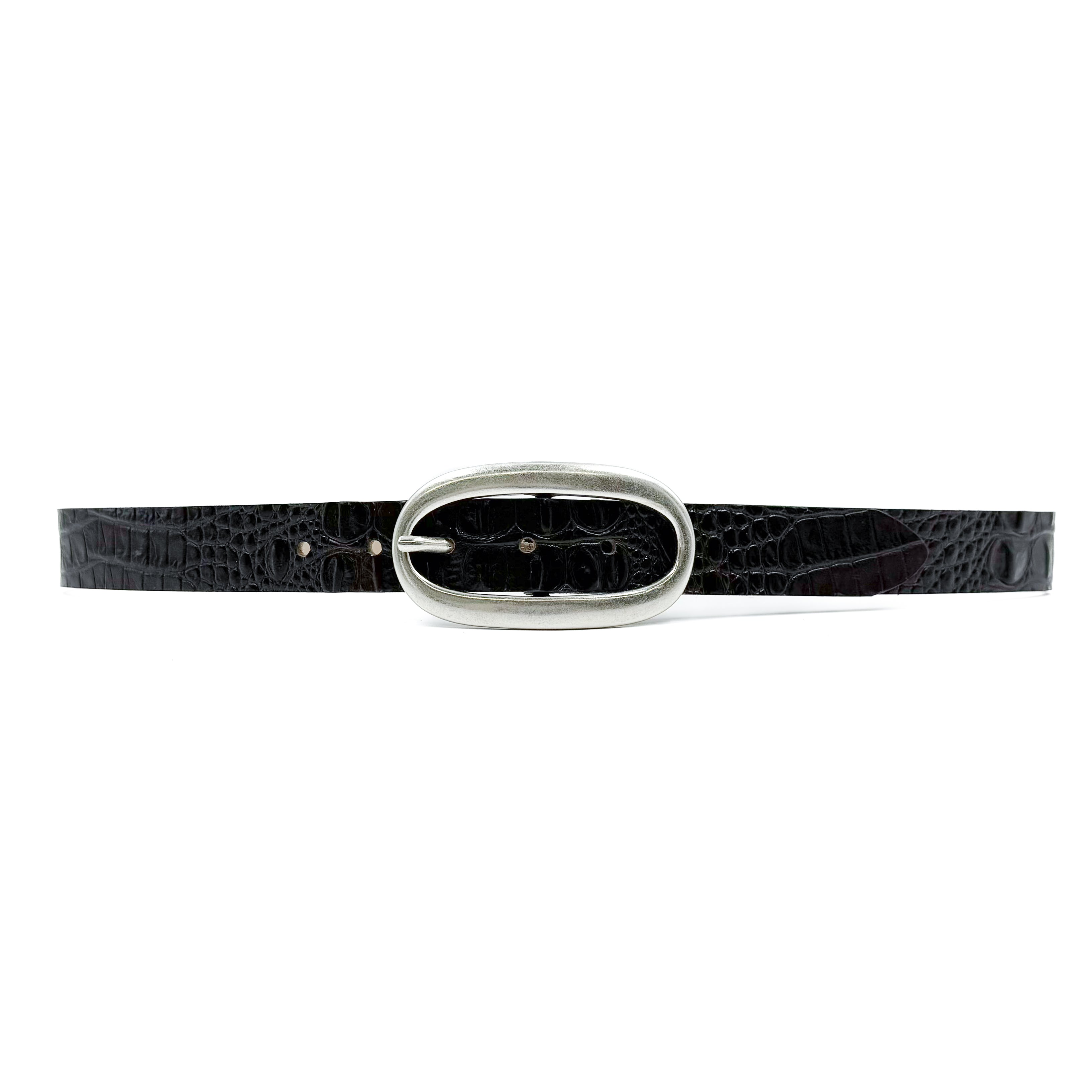 The Elowen Belt combines chic style with minimalist design. Crafted from dark brown croc-embossed Italian leather, this belt features an antique silver-plated center bar buckle. Made in the USA, it offers a touch of sophistication to any outfit.