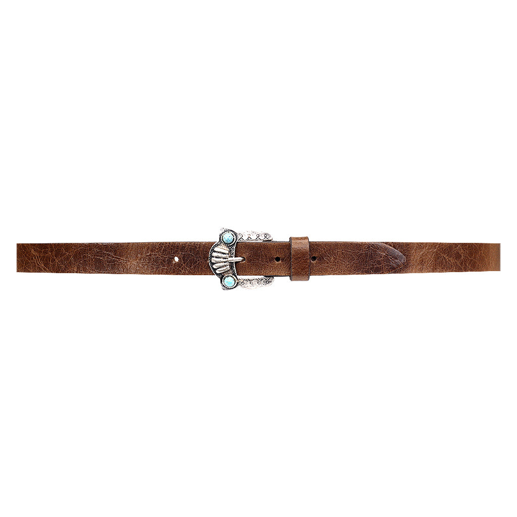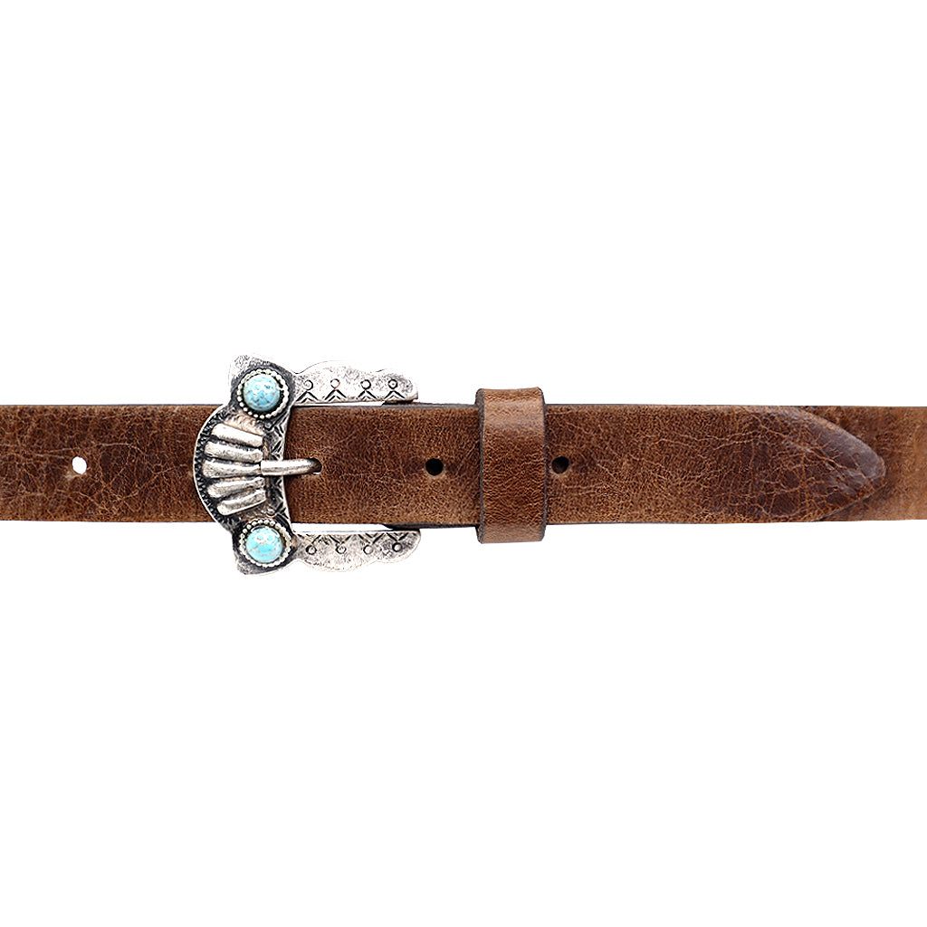 The Mary Belt blends Western charm with refined craftsmanship. Made from rich brown Italian leather, it’s finished with an old silver western-style buckle adorned with turquoise stones. At 1" wide, this versatile piece adds a subtle yet striking accent to any look. Handcrafted in the USA.