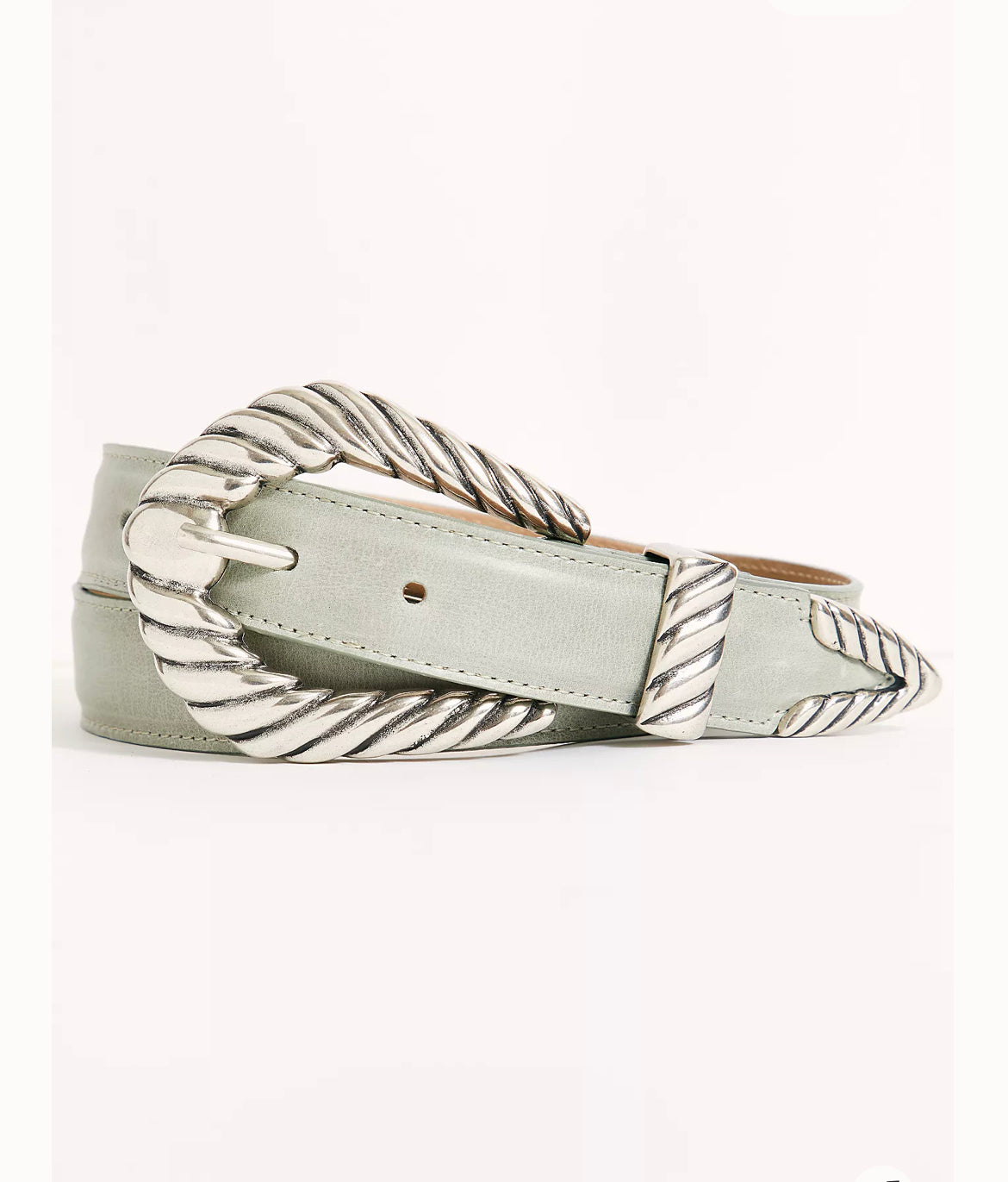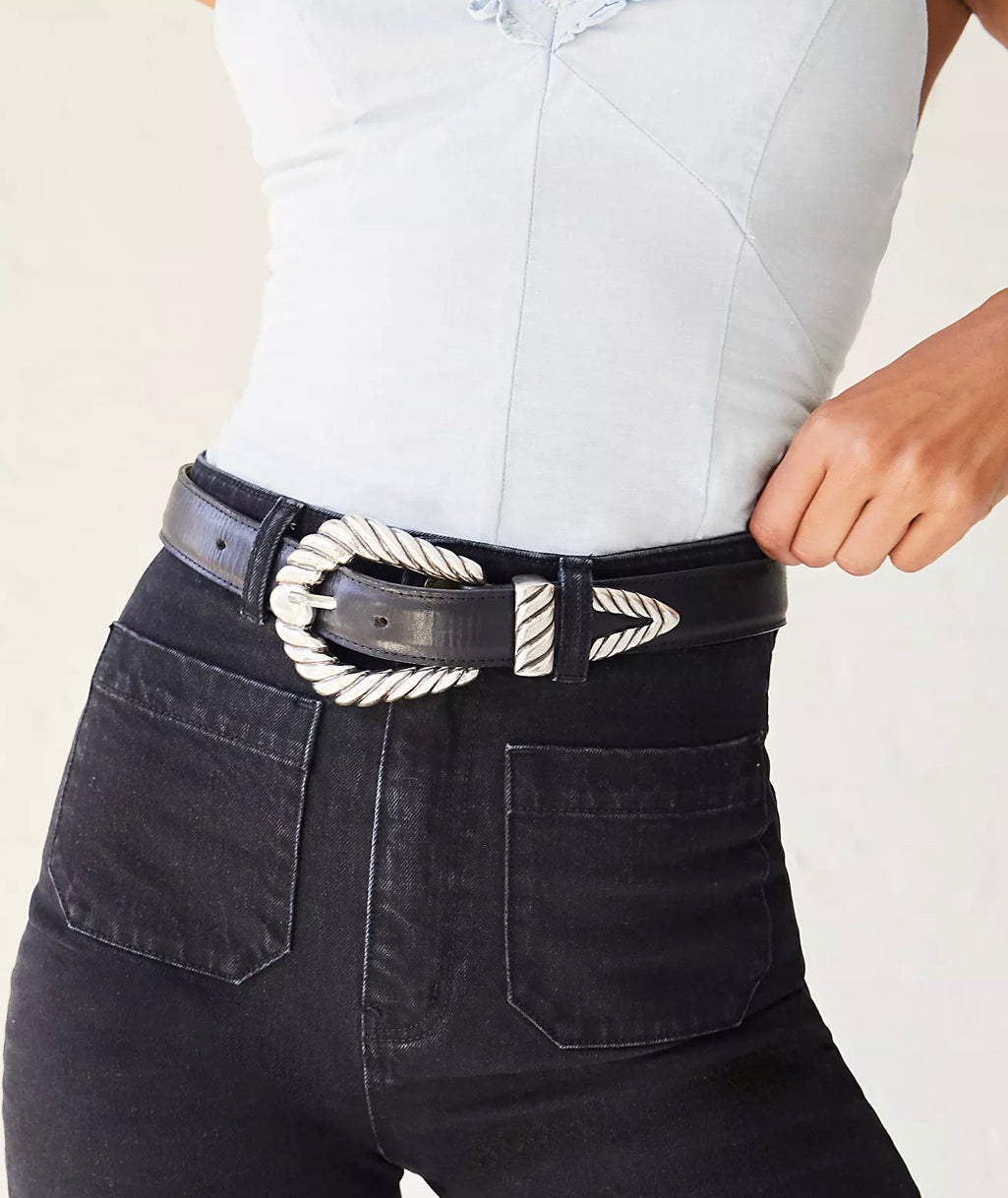 feather edged leather belt with antique silver buckle loop and tip