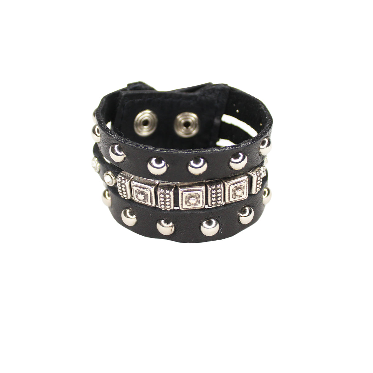Dreireihige Ledermanschette mit antikem Silberornament und silbernen Nieten, angeboten in Schwarz und Hellbraun.