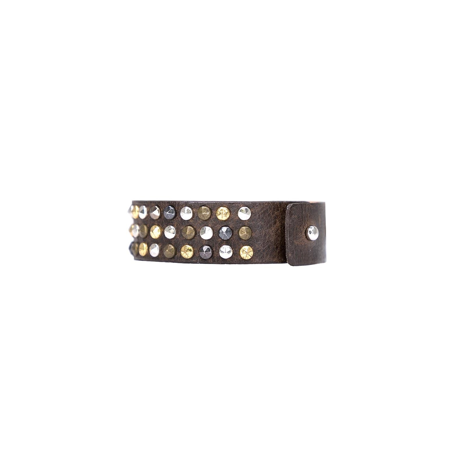 Diese stilvolle Gwen-Ledermanschette verfügt über eine dunkelbraune Lederbasis und dekorative Metallnieten. Es ist das perfekte Accessoire für jedes Outfit und verleiht einem lässigen Look eine raffinierte Note.
