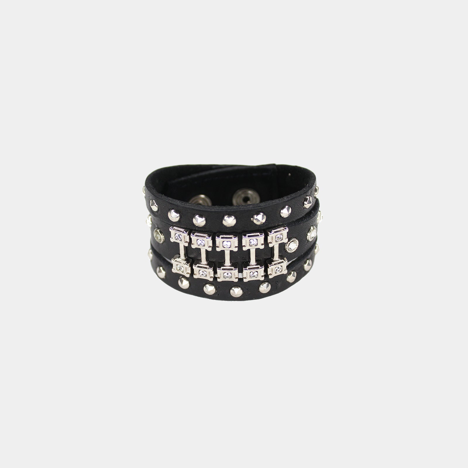 Dreireihige Ledermanschette, erhältlich in zwei Farbvarianten: Schwarz oder Braun, mit silbernen Nieten und Kristallen.