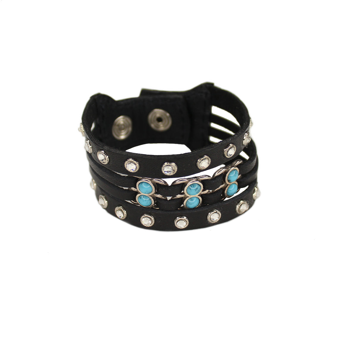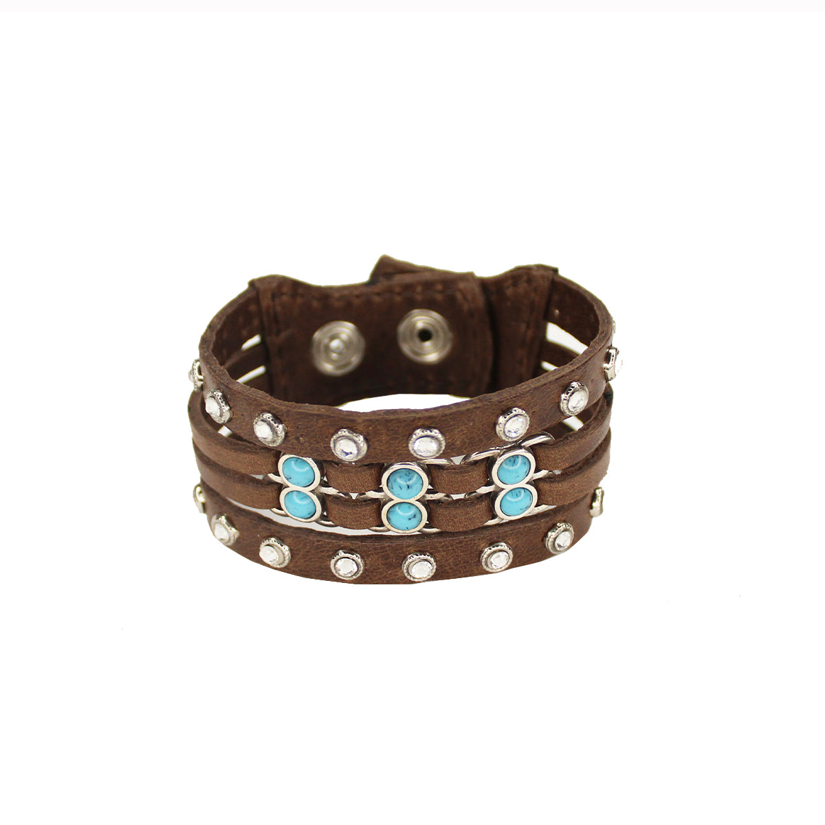 Die perfekte Manschette im Boho-Stil, entworfen mit einem dreisträngigen Lederarmband und detailliert mit silbernen und türkisfarbenen Beschlägen.