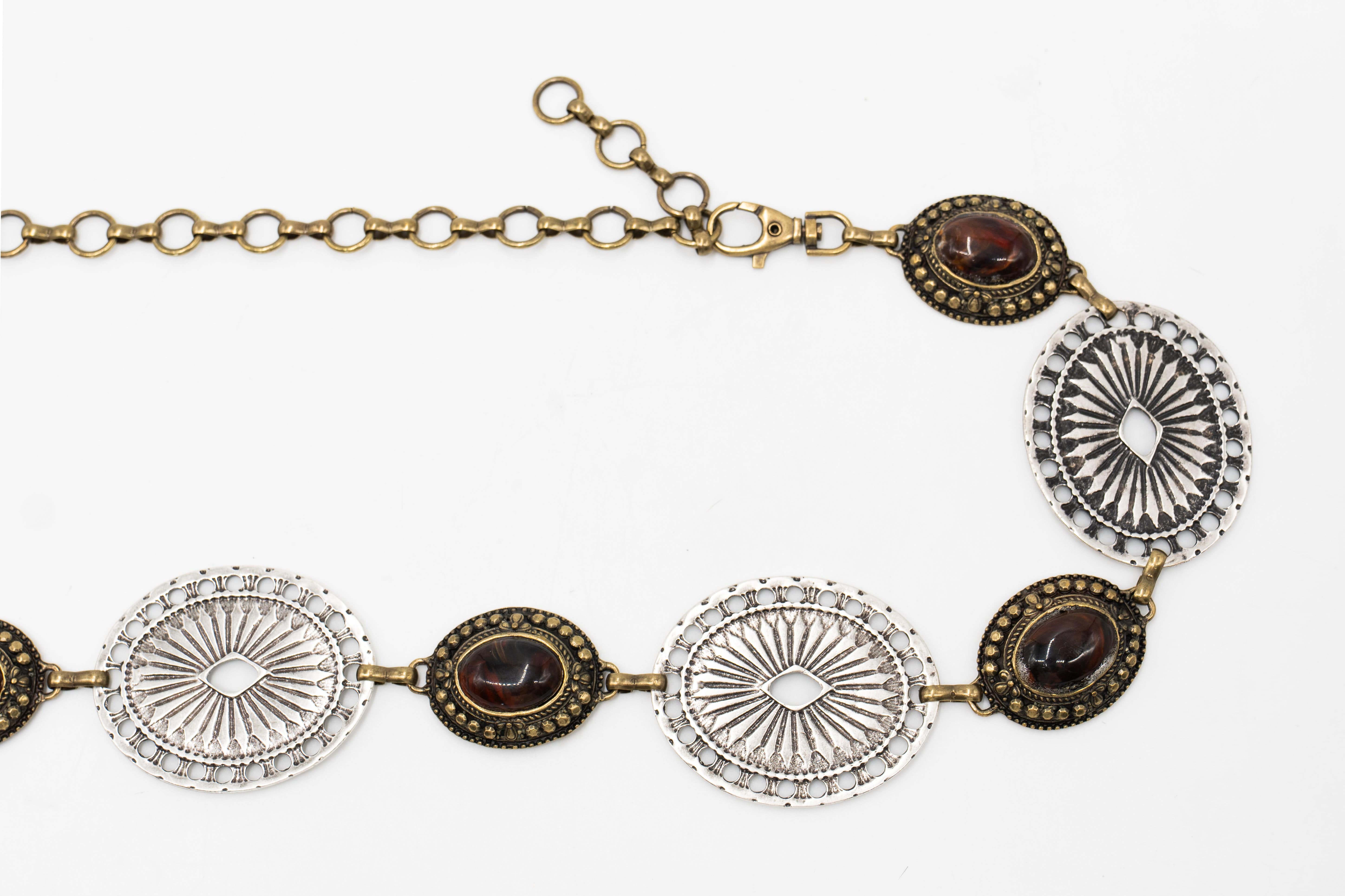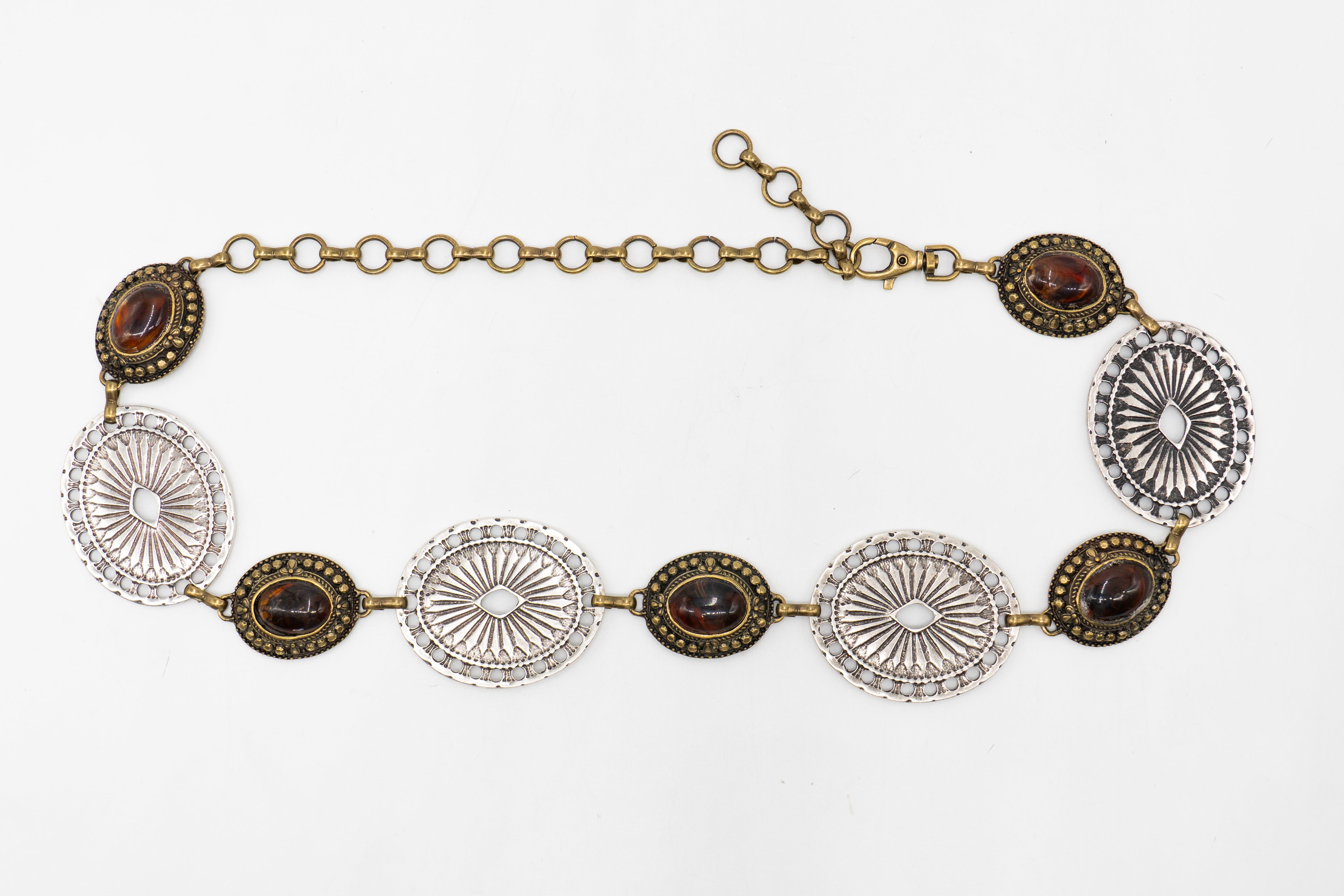 The Sequoia Belt brings a bohemian flair to your wardrobe with its striking two-toned chain design. Featuring a mix of brass and silver metals adorned with amber-colored stones, this belt adds a warm and earthy elegance to any ensemble. Ethically crafted with care, it’s a versatile statement piece for those who love eclectic style.