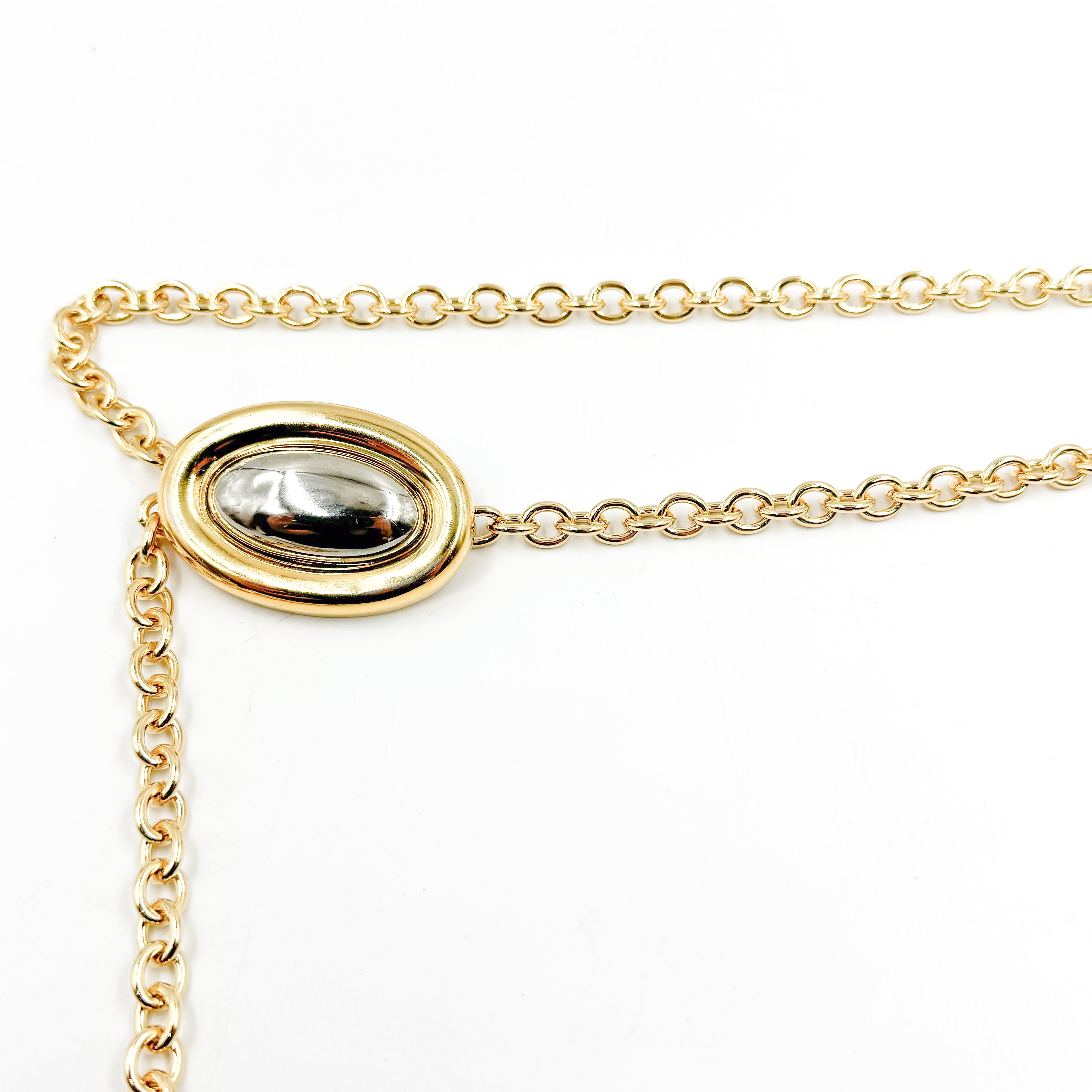 Elevate your look with the effortlessly chic Two-Tone Chain Belt, a stunning collaboration between Streets Ahead and Past Midnight. This belt features an eye-catching oval pendant in silver and gold, perfectly balancing elegance and boldness. Crafted with a luxurious gold chain and finished with a secure hook closure, this belt is designed to add sophistication to any outfit.