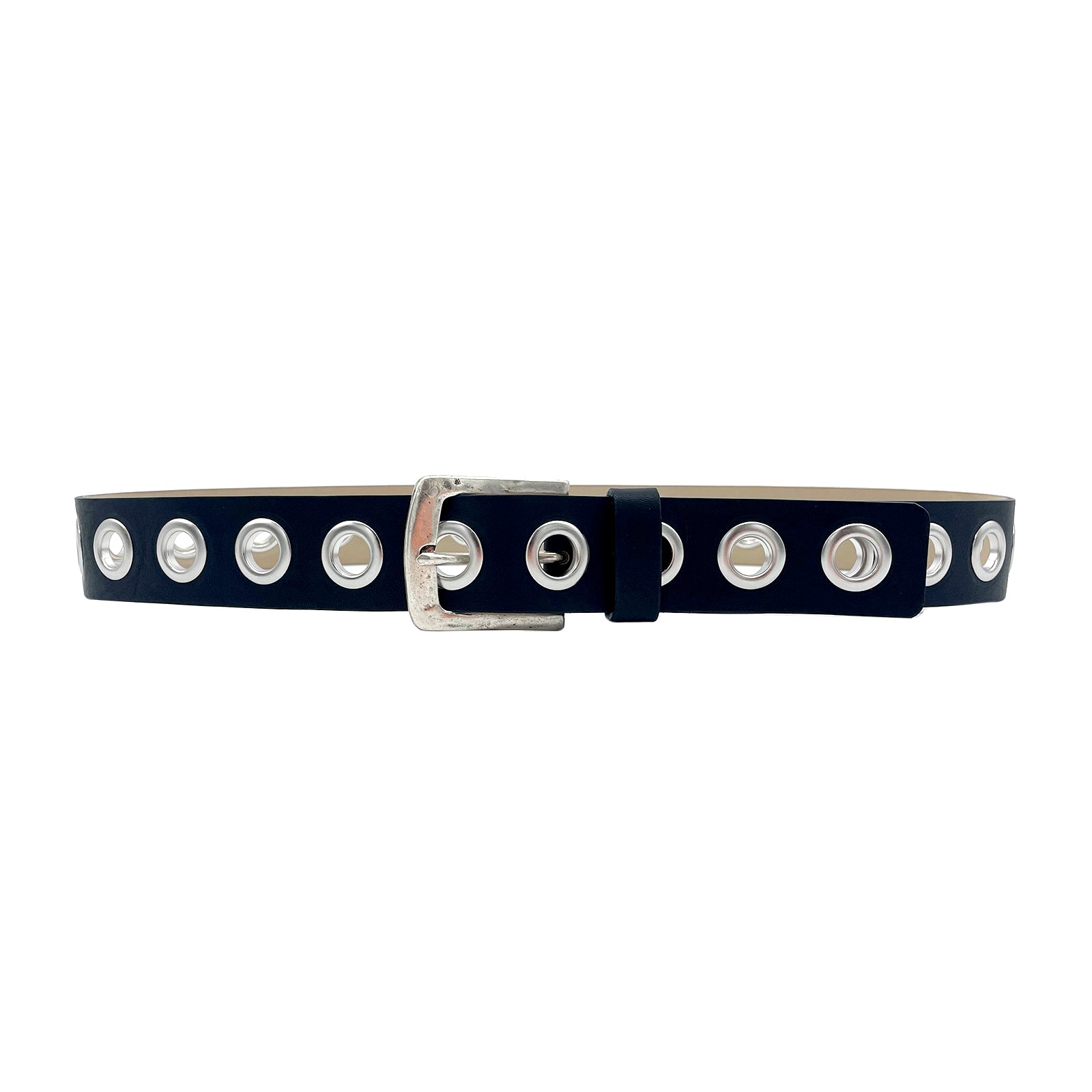 Ein unverzichtbarer Kleiderschrankgürtel! Der Ireland-Gürtel ist mit großen silbernen Ösen versehen und ist aus schwarzem und weißem italienischem Leder erhältlich.