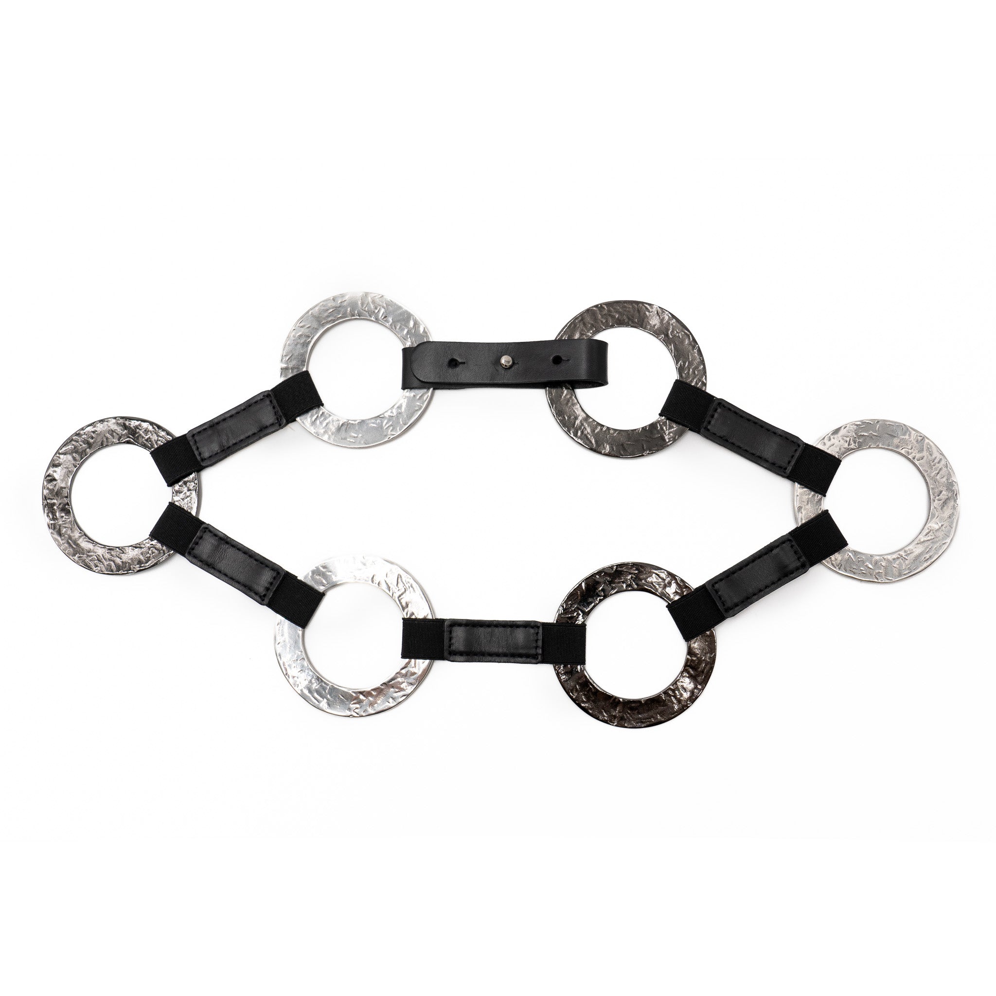 The Thalia Belt is made from smooth black Italian calfskin leather and detailed with oversized hammered silver and black rings. Each ring is custom-cast in Italy, giving the belt a refined yet industrial edge that transitions effortlessly from day to night.