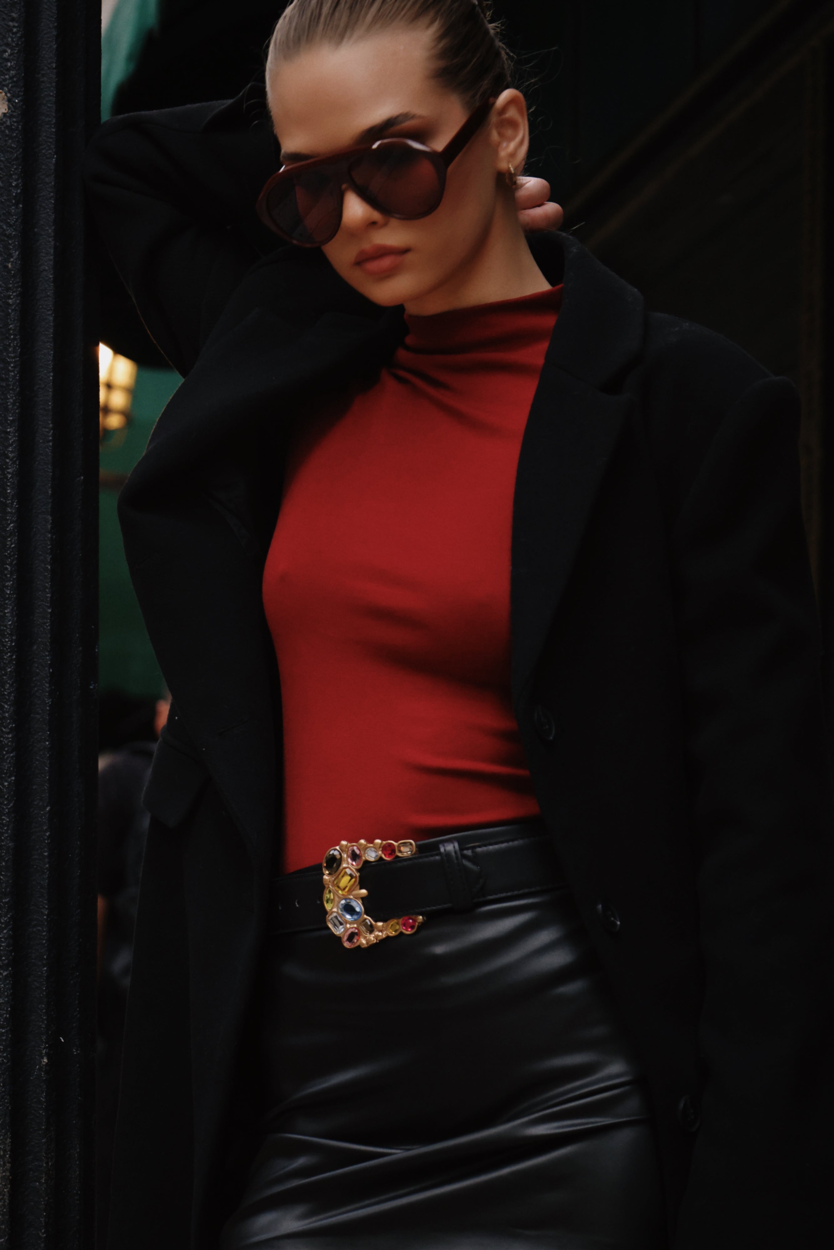 Made from smooth black Italian leather with a 24k gold-plated buckle set in multi-colored crystals. A statement piece that adds color and shine to any outfit.