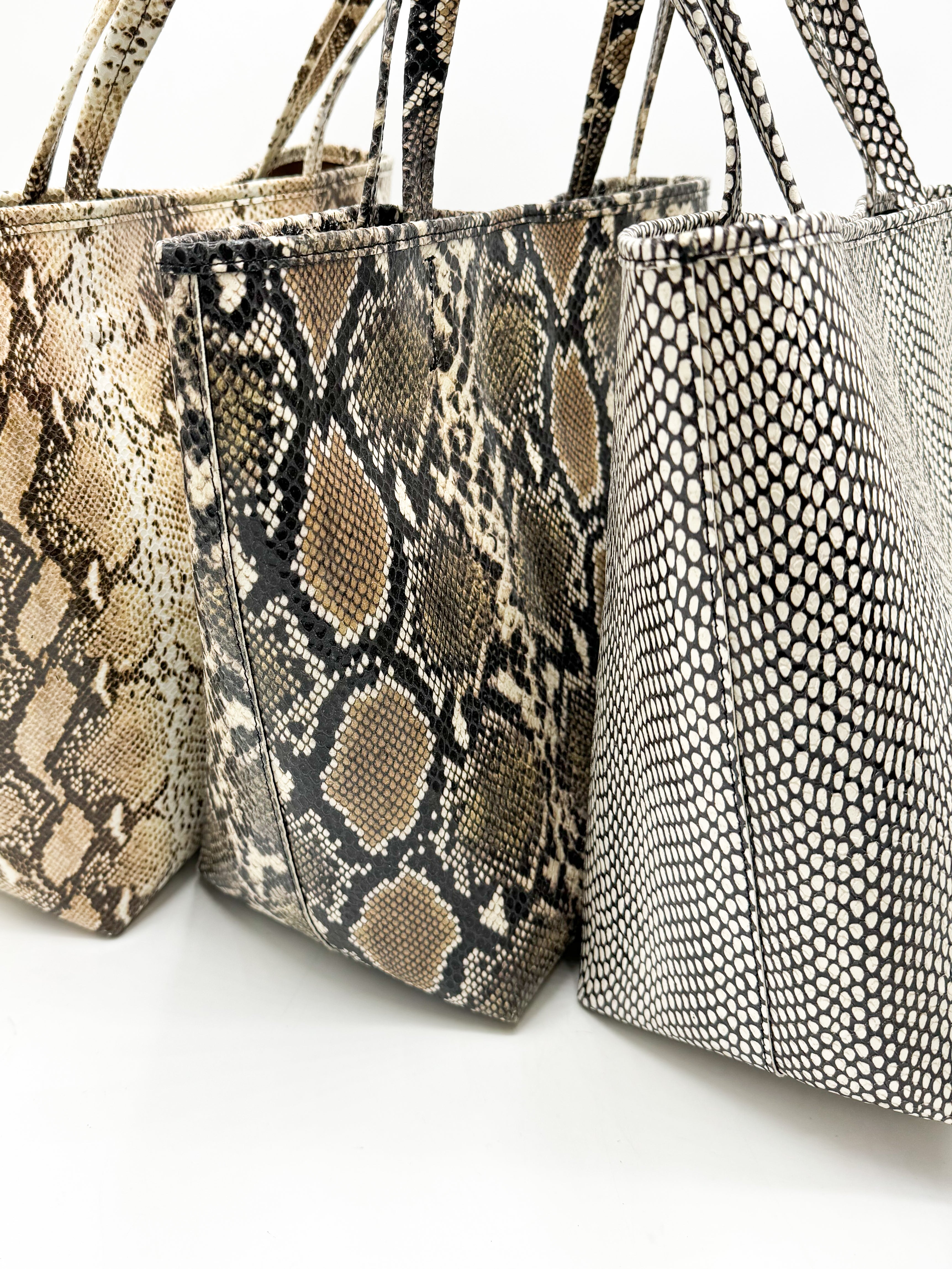 The Zahara Tote is crafted from dark snake-embossed Italian leather, making a striking statement with every wear. Lined with luxurious black suede, it features a spacious interior, an inside pocket for essentials, and a magnetic closure for seamless access. Designed for both style and function, this tote is the perfect balance of edge and elegance.