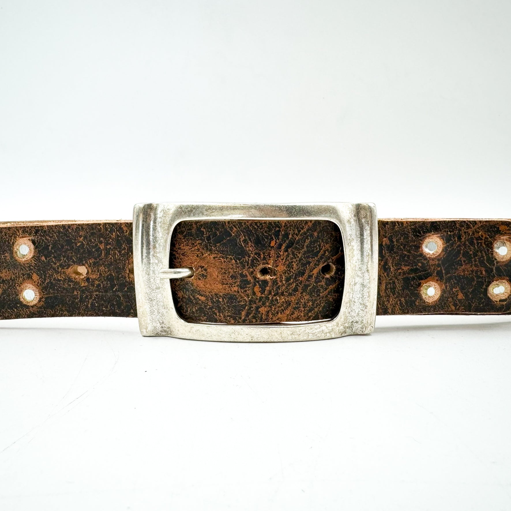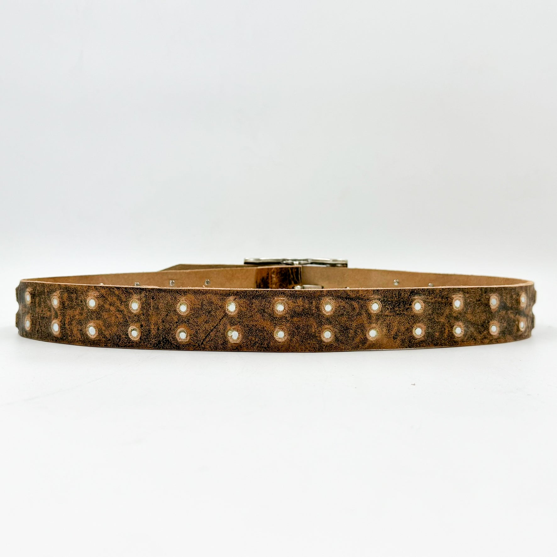 The Dakota belt is made from distressed leather and features metal studs and a silver-tone rectangular buckle. It's durable and stylish, suitable for both casual and formal wear.
