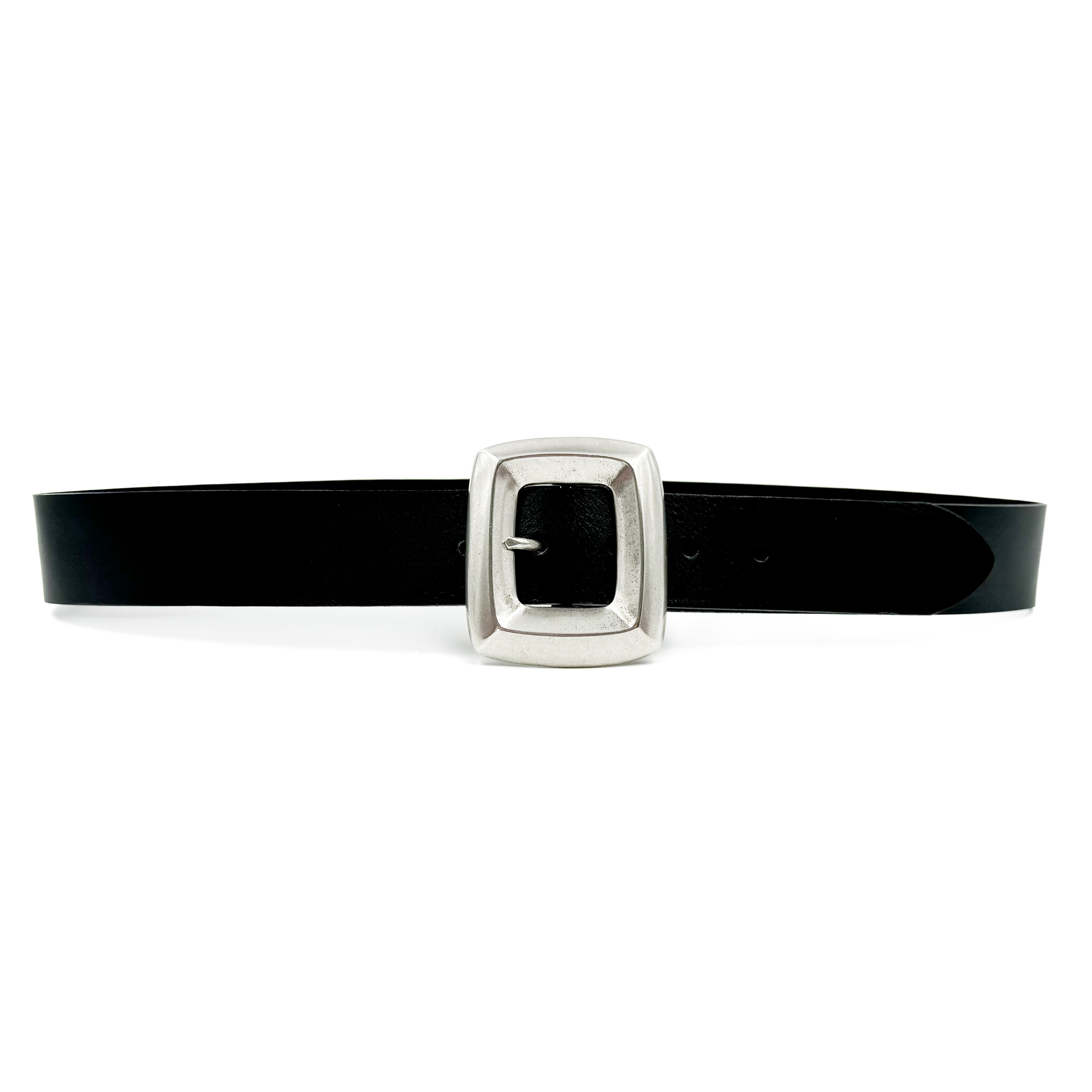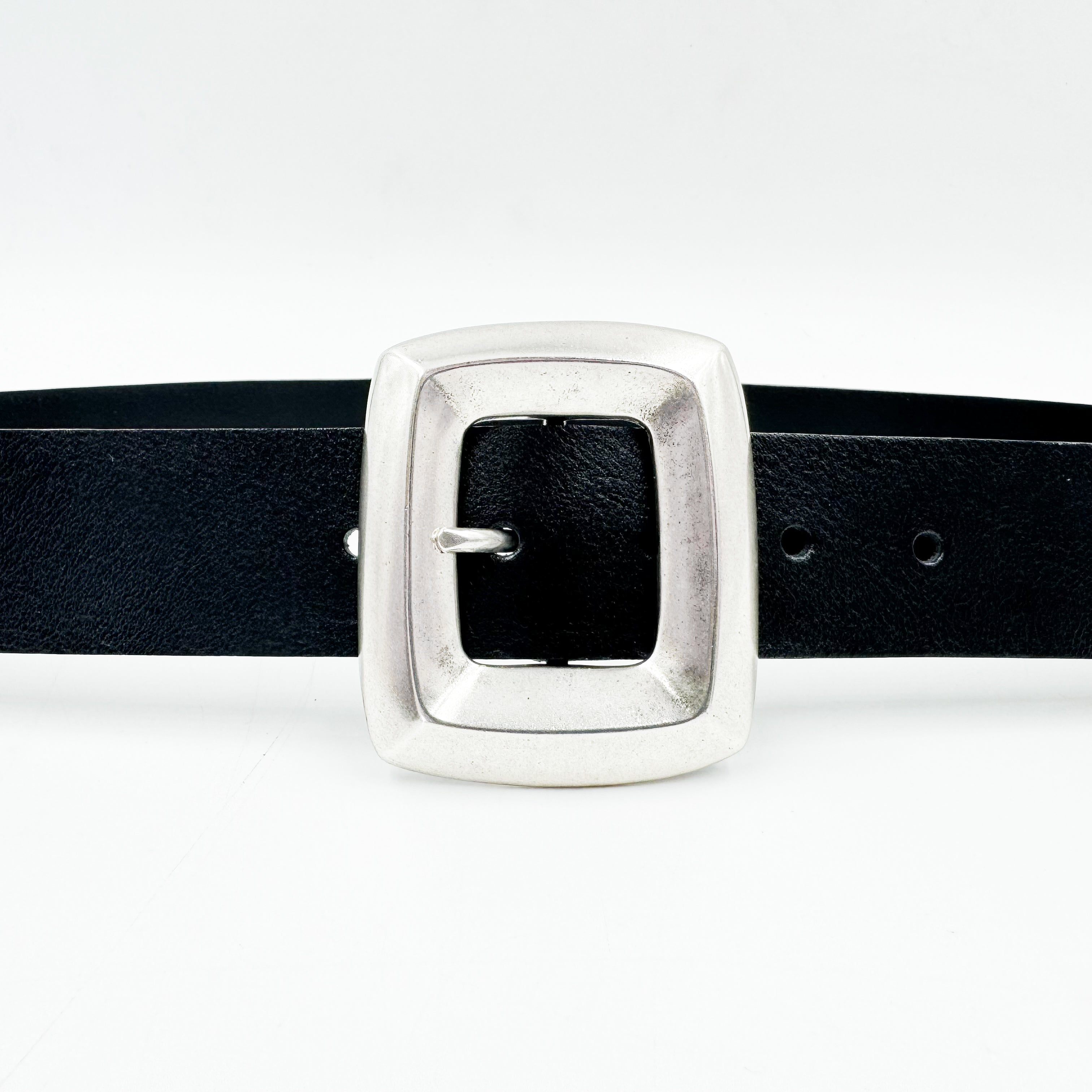 The Stormi Belt combines classic chic with bold style, featuring smooth black Italian leather and a vintage silver-plated buckle. This timeless piece adds a sophisticated edge to any outfit.