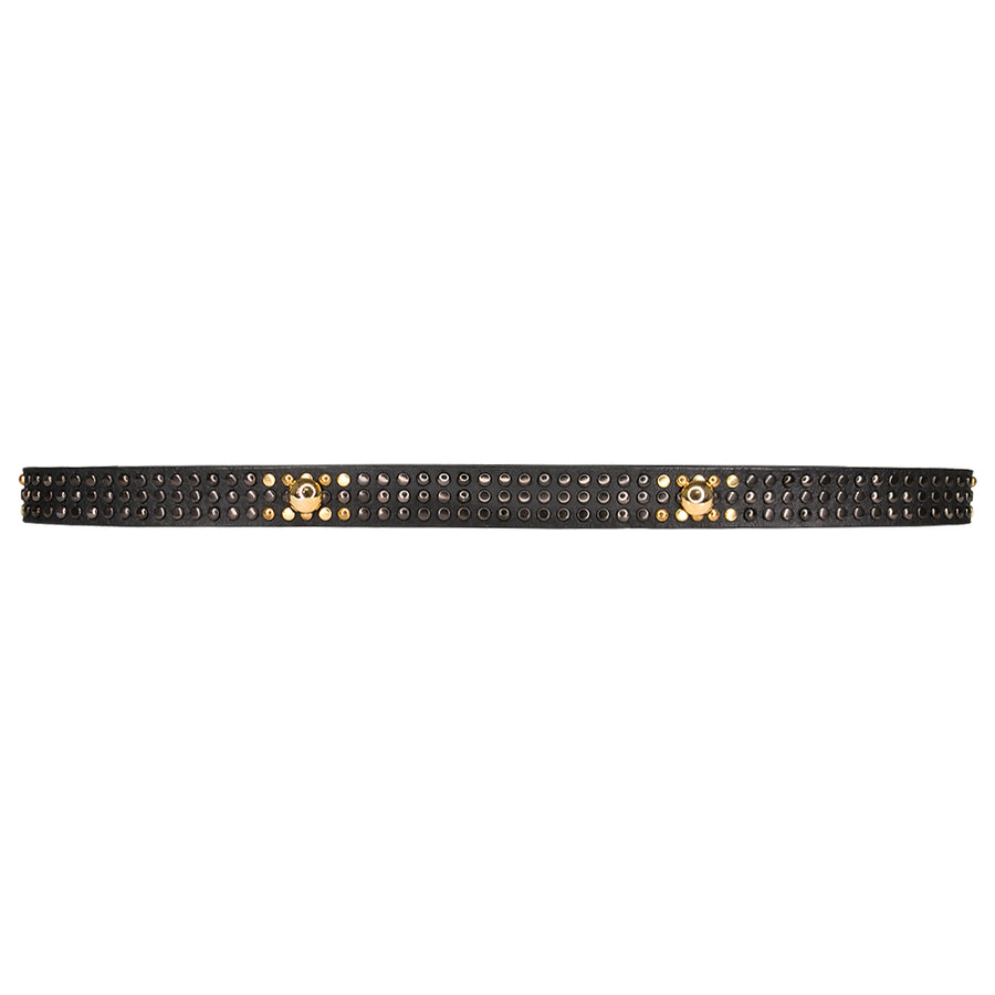 Schwarzer Ledergürtel mit gemischten Metallnieten und einer goldenen Schnalle